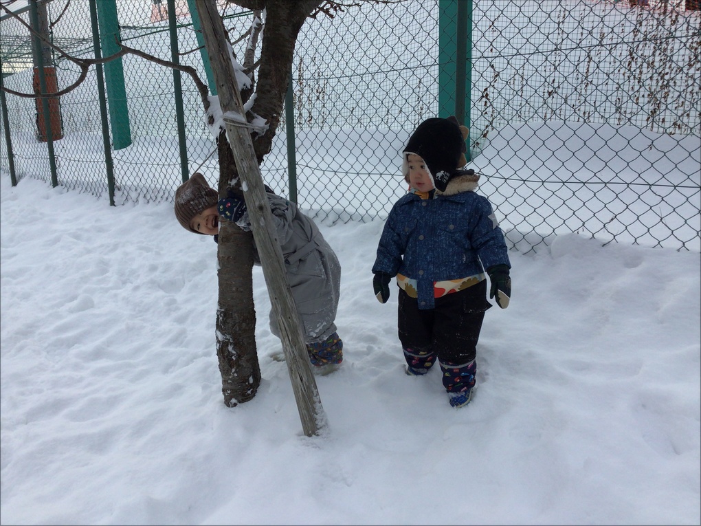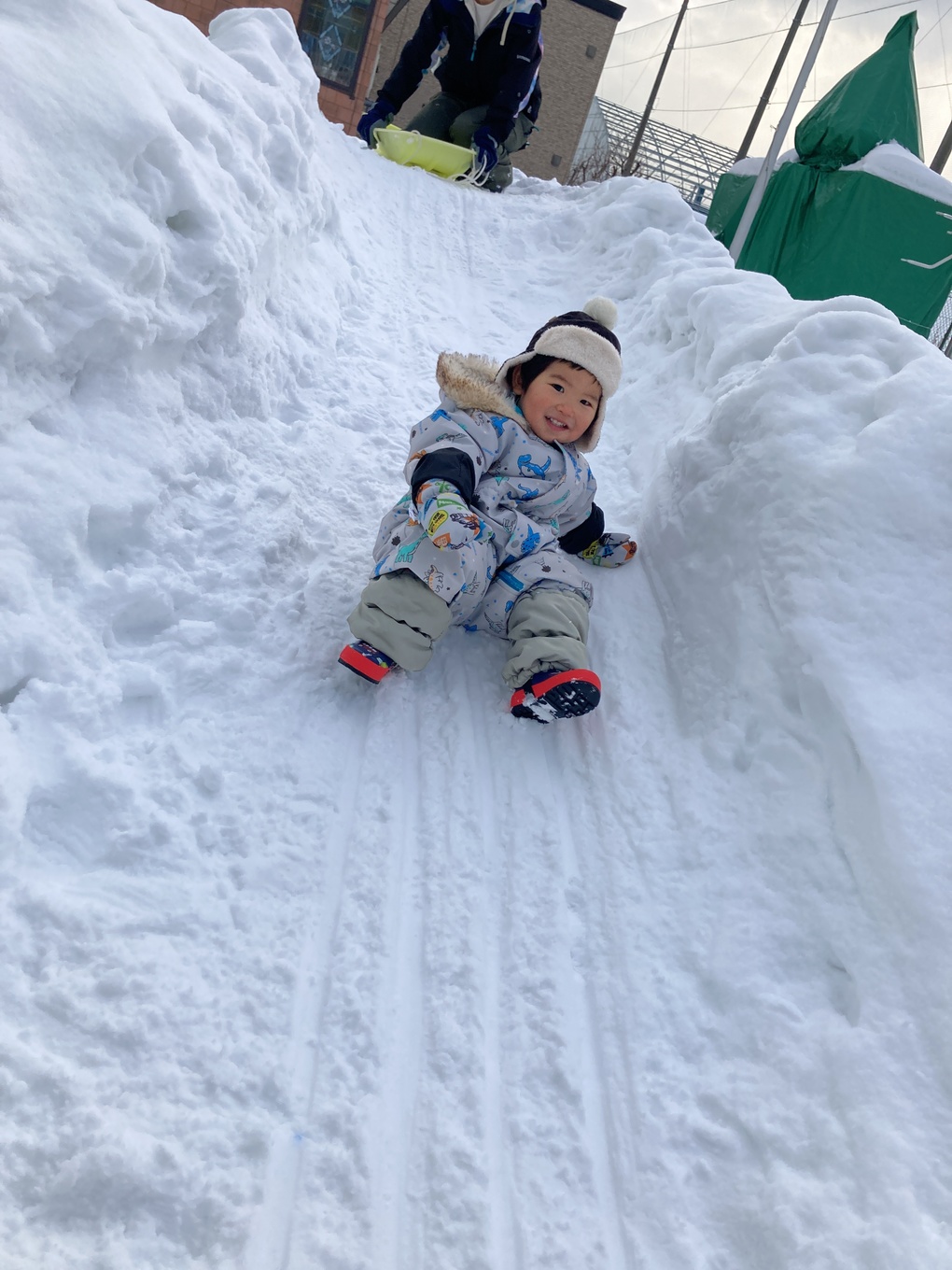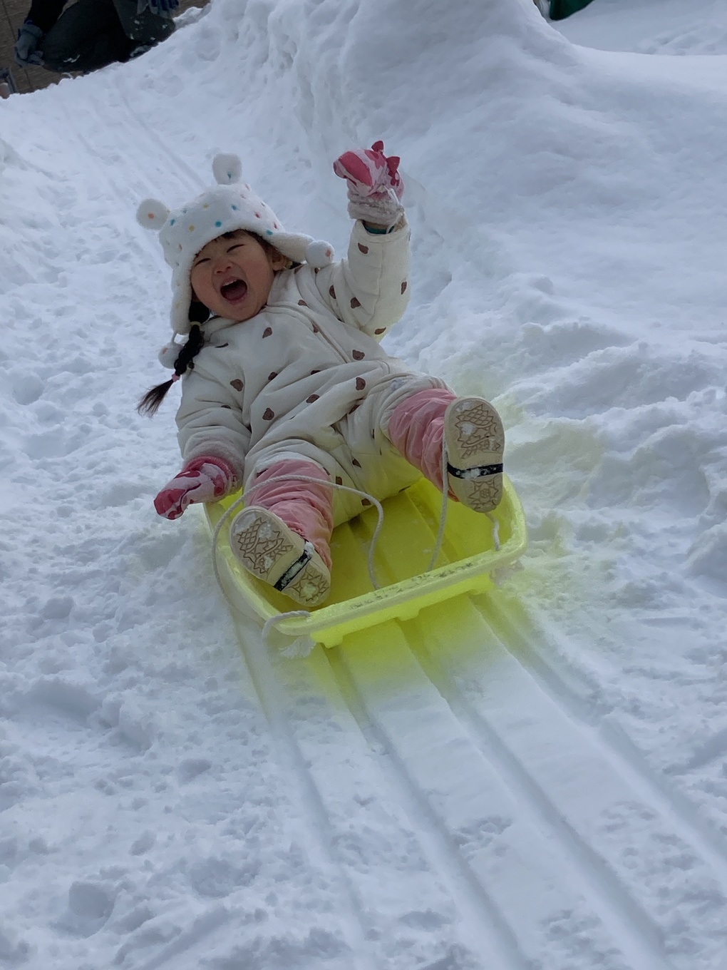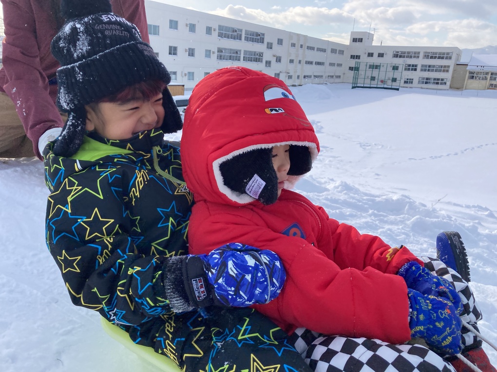 1月に入り、連日雪が降り積もり、毎日雪に触れて遊べるようになりました。そりに乗って近くの公園に散歩に行ったり、園庭でも雪山を作り、そり滑りを楽しんでいます!「お外行くよー」と伝えると嬉しそうな子どもたちです⛄