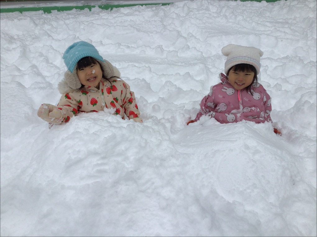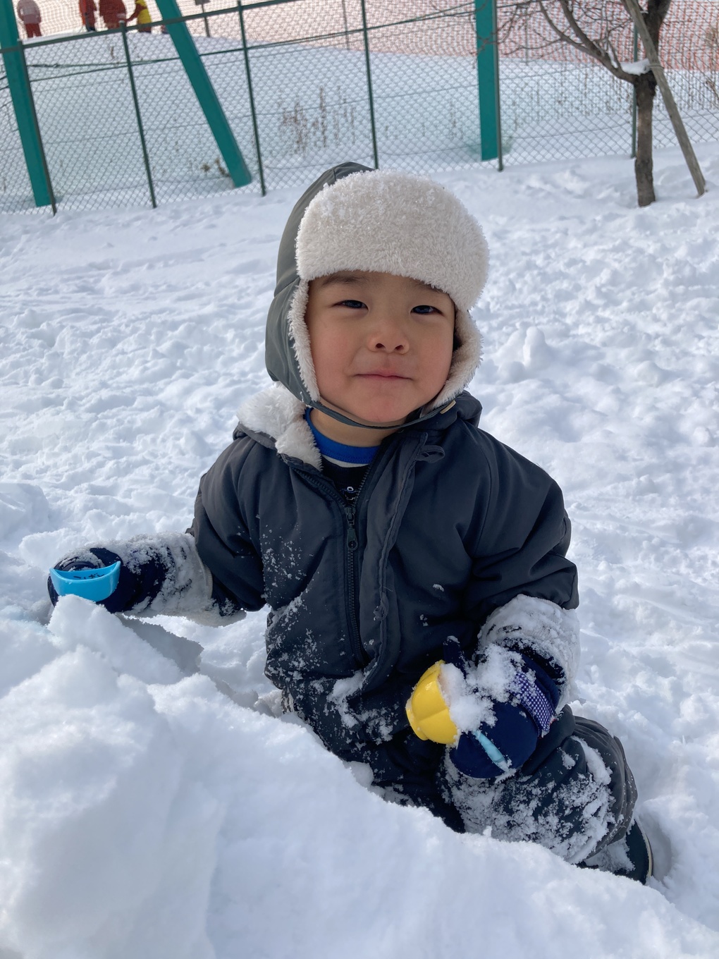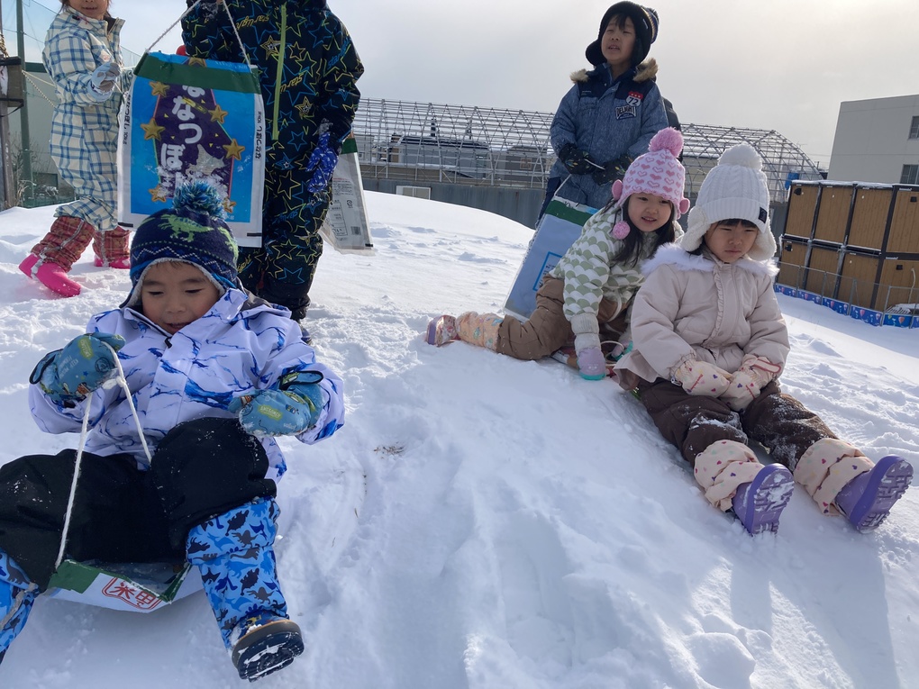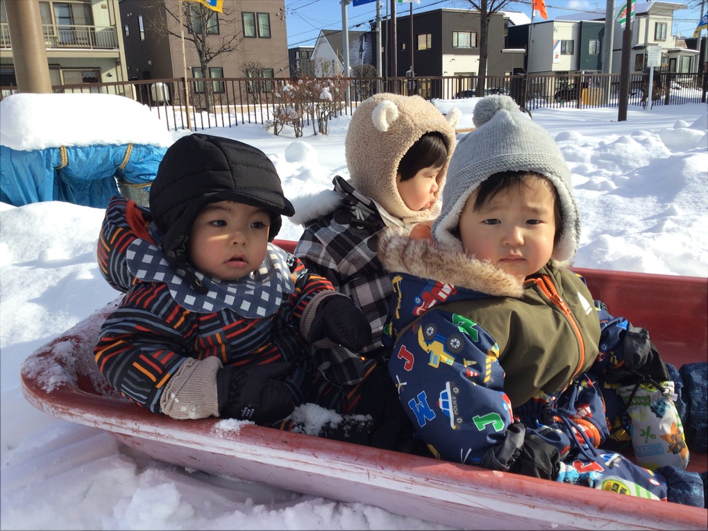 1月に入り、連日雪が降り積もり、毎日雪に触れて遊べるようになりました。そりに乗って近くの公園に散歩に行ったり、園庭でも雪山を作り、そり滑りを楽しんでいます!「お外行くよー」と伝えると嬉しそうな子どもたちです⛄